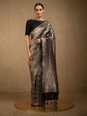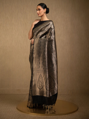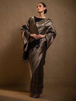 Directly crafted from the heart of Banaras, this Black Silk Brocade Handloom Banarasi Saree combines traditional artistry with modern elegance. Its soft brocade fabric offers effortless draping and lightweight comfort, making it an ideal choice for young women who appreciate timeless style with a contemporary touch. This saree’s rich texture and classic appeal make it perfect for both formal occasions and festive celebrations.