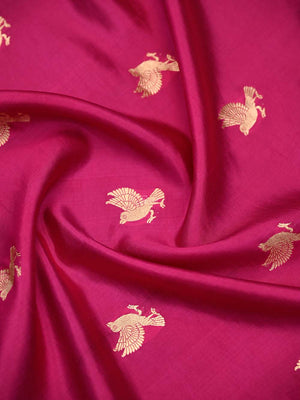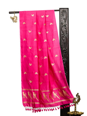Beautiful pure Katan silk dupatta in dark pink color. It has Shikargah gold zari booti which gives a charismatic and ravishing look when worn. Its Royalty is made in Banaras...