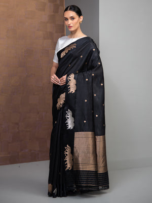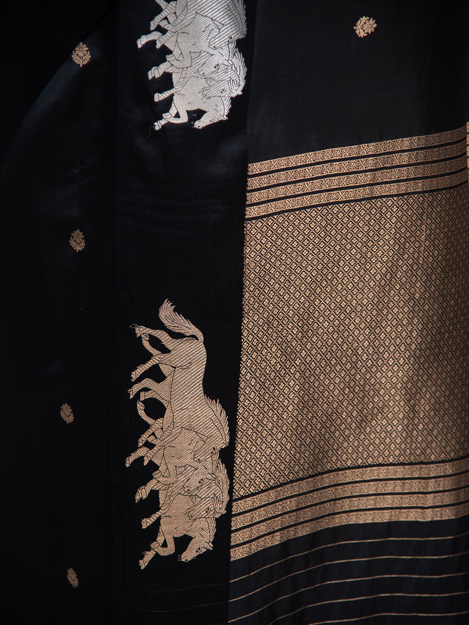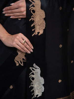 This elegant black pure silk saree offers a lightweight and comfortable drape, making it an ideal choice for festivals and weddings. It features exquisite animal motifs along the border and a striking gold zari pallu, blending traditional craftsmanship with understated sophistication. The saree’s vibrant hues and minimalistic design create a graceful, refined look suitable for special occasions.