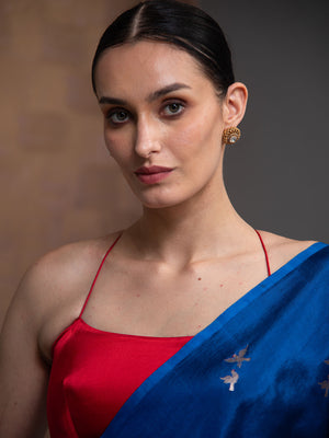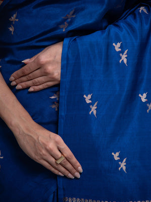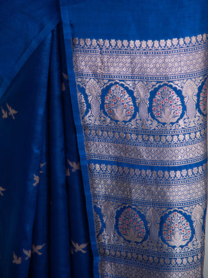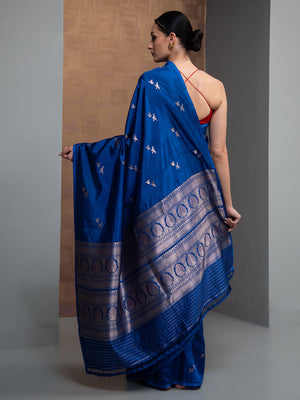 This elegant blue pure silk saree offers a lightweight and comfortable drape, making it an ideal choice for festivals and weddings. It features exquisite animal motifs along the border and a striking gold zari meenakari pallu, blending traditional craftsmanship with understated sophistication. The saree’s vibrant hues and minimalistic design create a graceful, refined look suitable for special occasions.