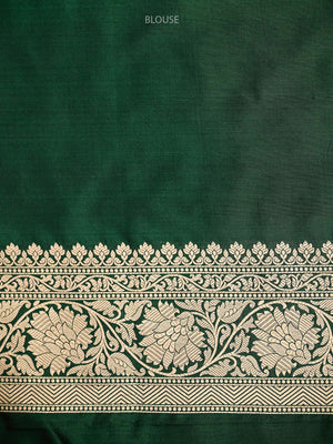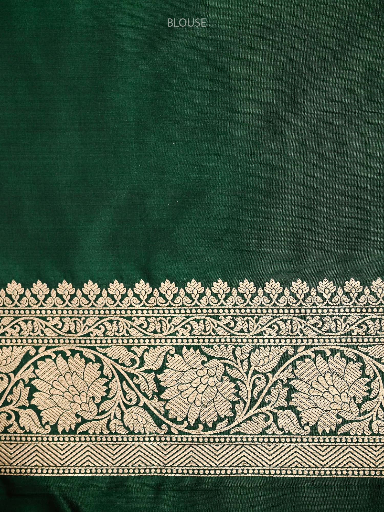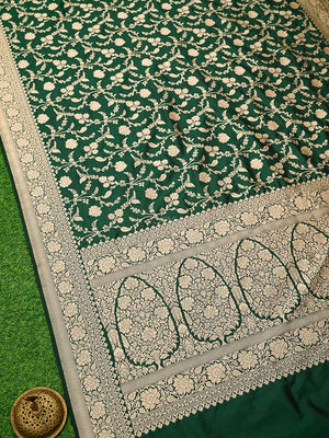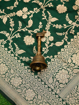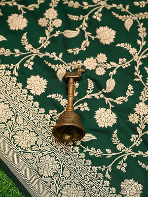 Authentic bottle green uppada silk Banarasi saree featuring gold zari jaal work. This handloom masterpiece offers luxurious texture and traditional craftsmanship, making it ideal for weddings and special celebrations.