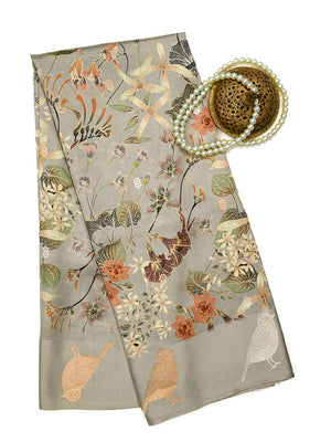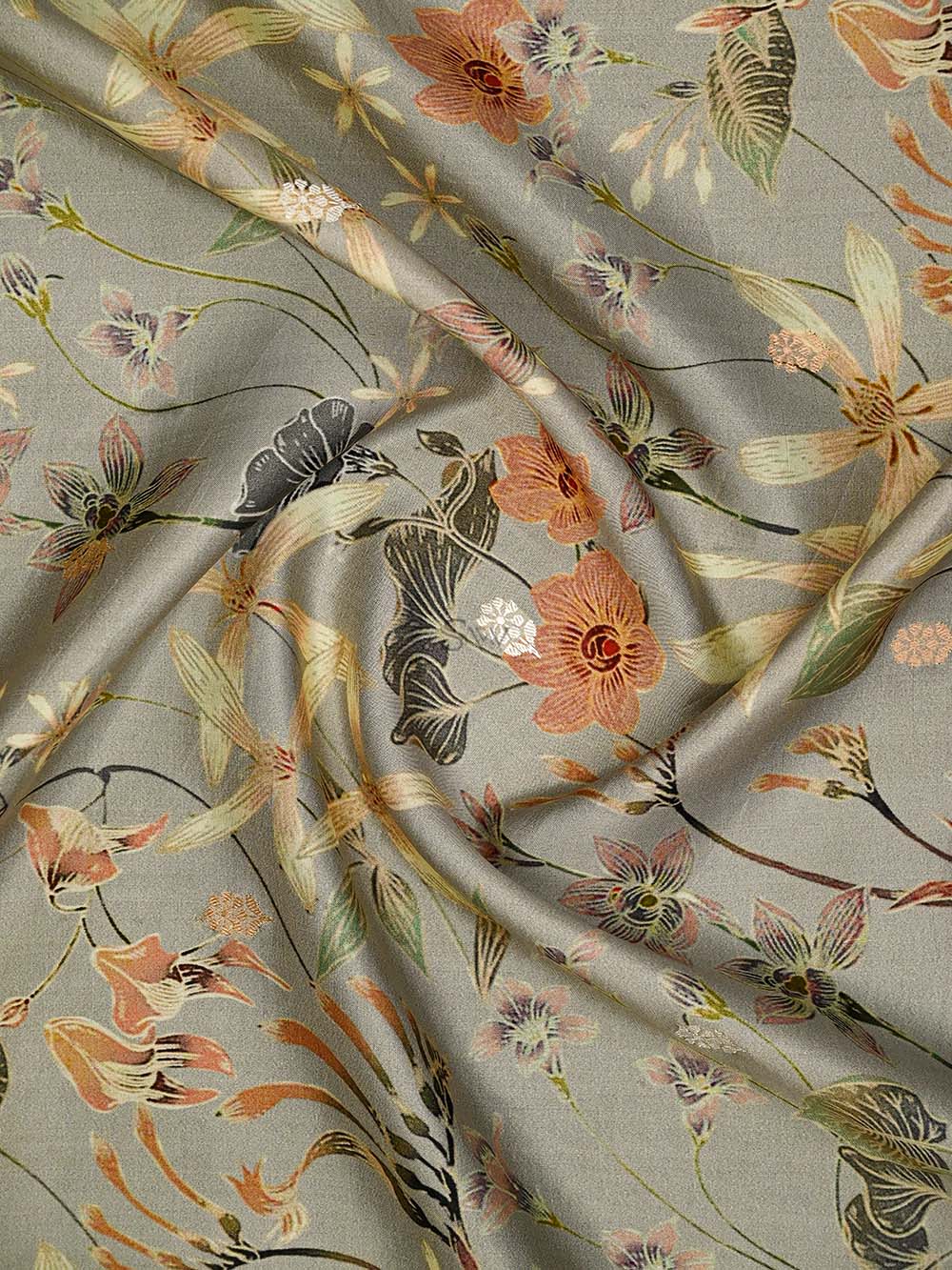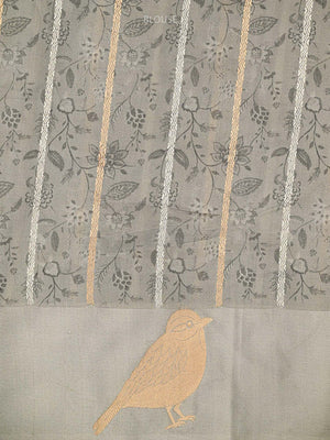 This elegant, grey pure silk saree boasts vibrant digital floral designs & exquisite bird motifs, along with a striking gold zari pallu and satin silk border. Its lightweight, comfortable drape and vibrant hues make it perfect for festivals & weddings, blending traditional craftsmanship with understated sophistication.