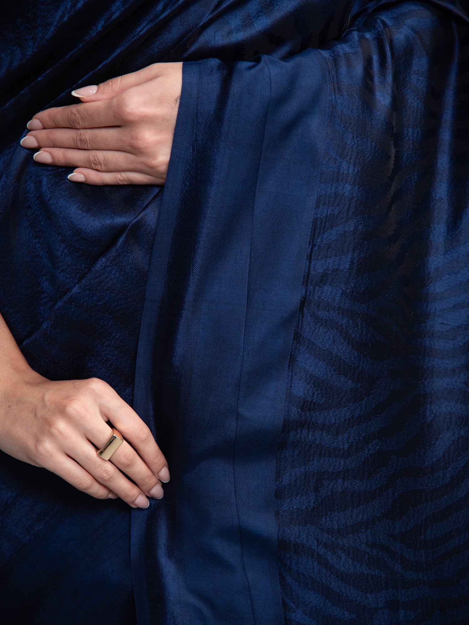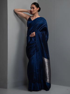 Midnight blue pure silk banarasi saree with tanchoi jaal across the body. It has a resham border and zari pallu.It's an artistic tradition and a classic masterpiece. This marvelous piece must for your trousseau collection.