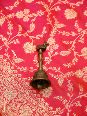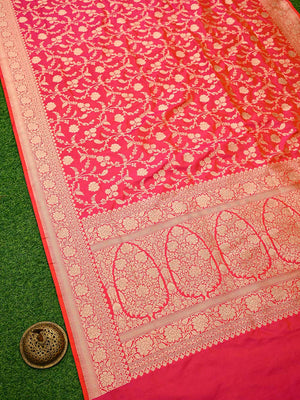 Authentic pink orange uppada silk Banarasi saree featuring gold zari jaal work. This handloom masterpiece offers luxurious texture and traditional craftsmanship, making it ideal for weddings and special celebrations.