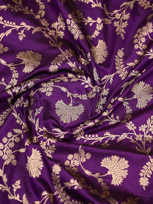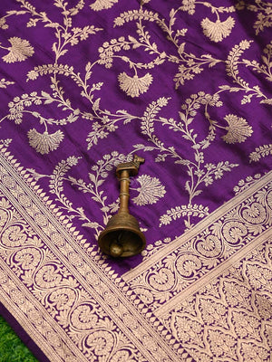 Authentic purple uppada silk Banarasi saree featuring gold zari jaal work. This handloom masterpiece offers luxurious texture and traditional craftsmanship, making it ideal for weddings and special celebrations.