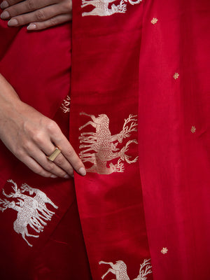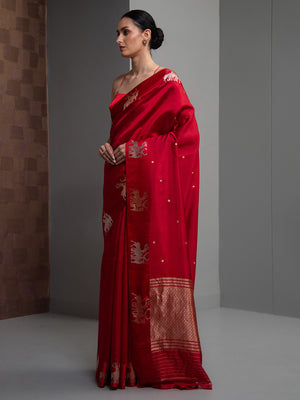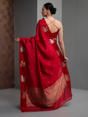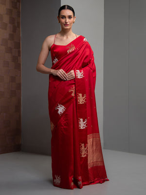 This elegant red pure silk saree offers a lightweight and comfortable drape, making it an ideal choice for festivals and weddings. It features exquisite animal motifs along the border and a striking gold zari pallu, blending traditional craftsmanship with understated sophistication. The saree’s vibrant hues and minimalistic design create a graceful, refined look suitable for special occasions.