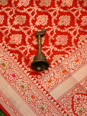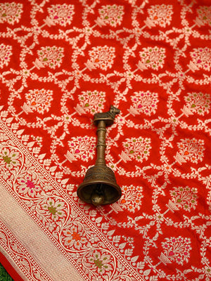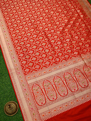 Authentic red uppada silk Banarasi saree featuring gold zari meenakari jaal work. This handloom masterpiece offers luxurious texture and traditional craftsmanship, making it ideal for weddings and special celebrations.