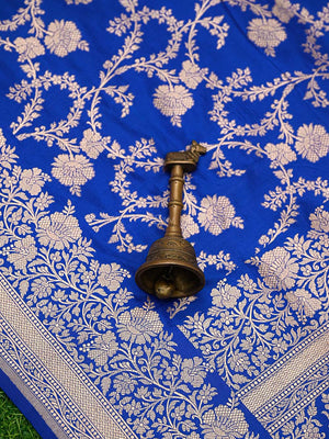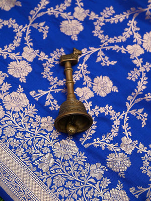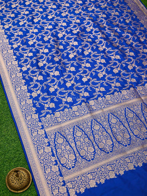 Authentic royal blue uppada silk Banarasi saree featuring gold zari jaal work. This handloom masterpiece offers luxurious texture and traditional craftsmanship, making it ideal for weddings and special celebrations.