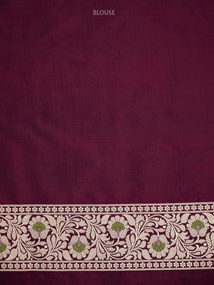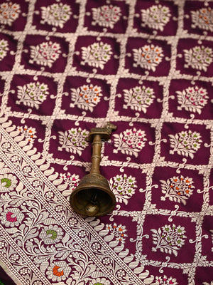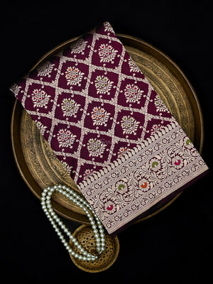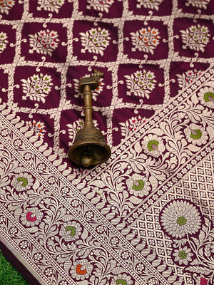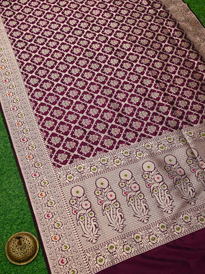 Authentic wine uppada silk Banarasi saree featuring gold zari meenakari jaal work. This handloom masterpiece offers luxurious texture and traditional craftsmanship, making it ideal for weddings and special celebrations.