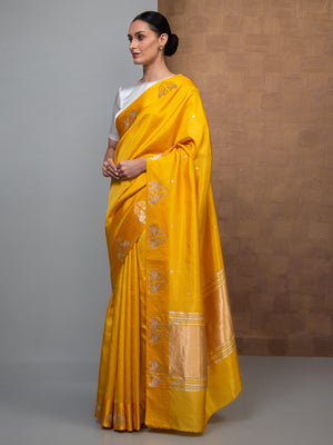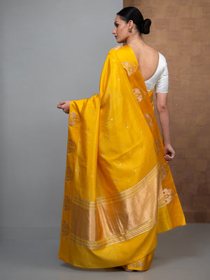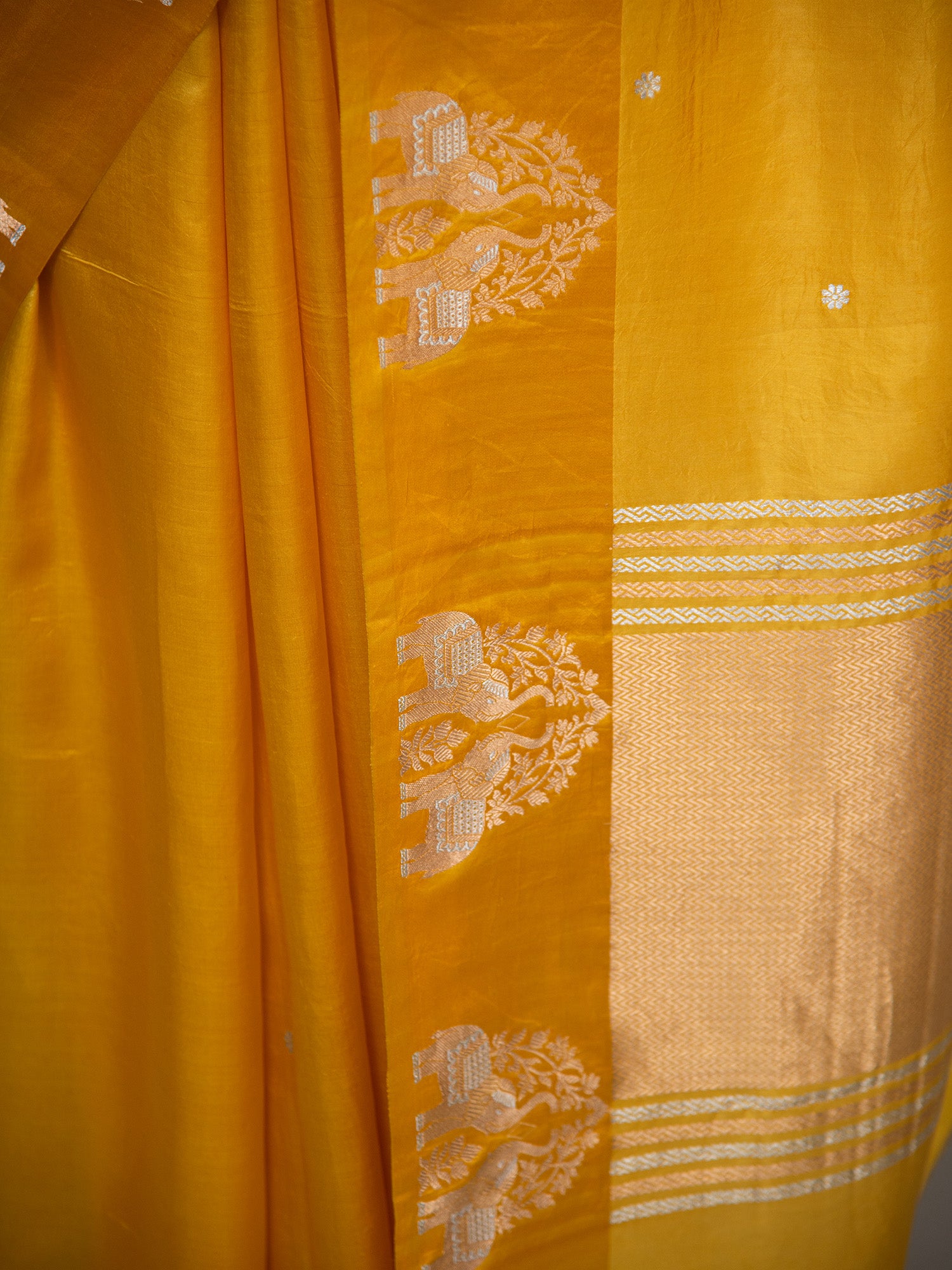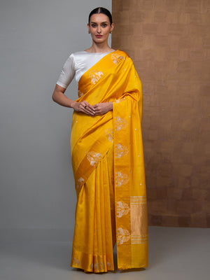 This elegant yellow silk saree offers a lightweight and comfortable drape, making it an ideal choice for festivals and weddings. It features exquisite animal motifs along the border and a striking gold zari pallu, blending traditional craftsmanship with understated sophistication. The saree’s vibrant hues and minimalistic design create a graceful, refined look suitable for special occasions.