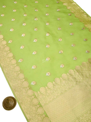 Pure organza sarees by sacred weaves in parrot green. It has a beautiful gold zari border. Saree has a meenakari silver-gold zari boota all over. This charming handwoven organza saree in the daintiest of hues and beguiling zari work is apt for all celebrations. The Saree looks stunning and captivating on the drape.