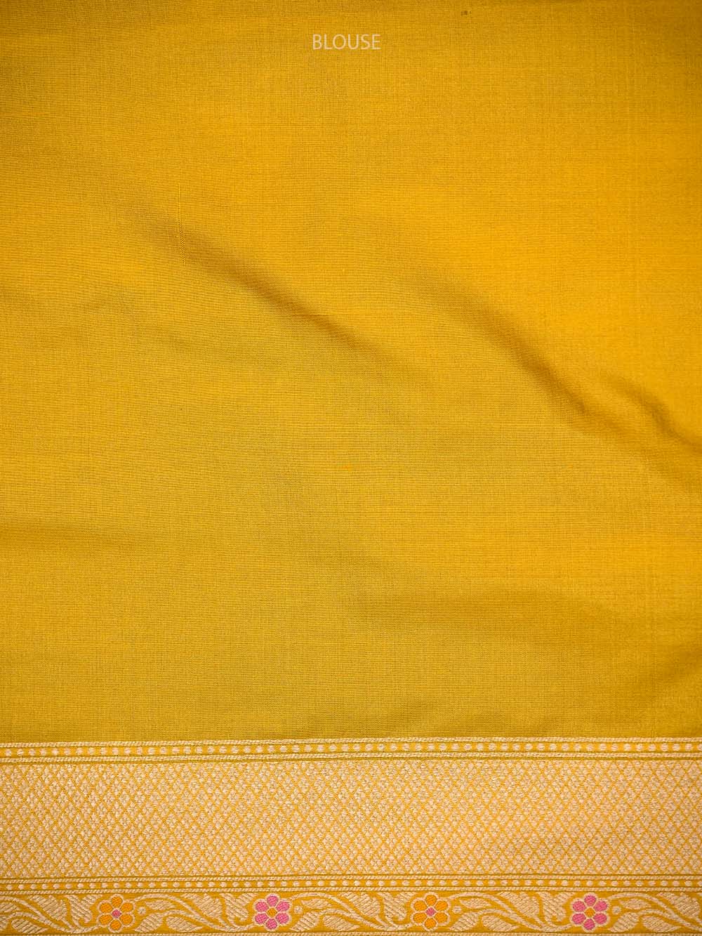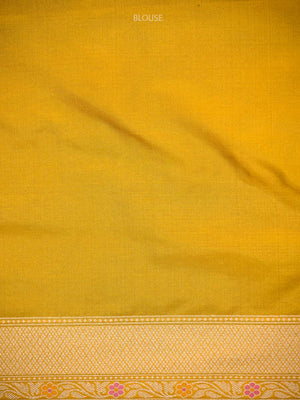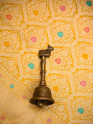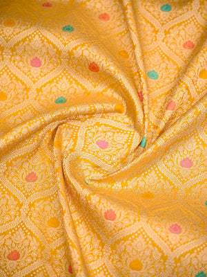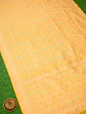 A Beautiful yellow color pure katan silk Banarasi saree with gold zari floral brocade all over.