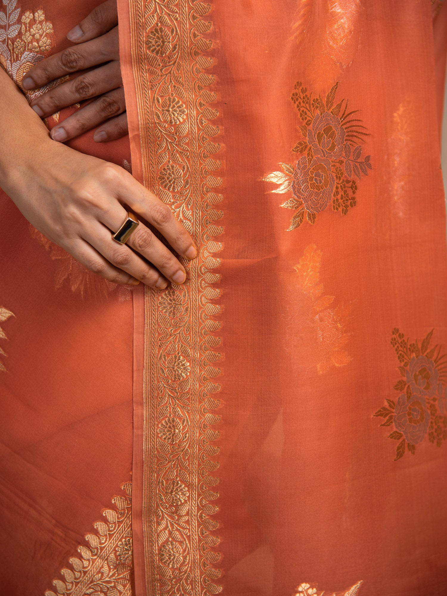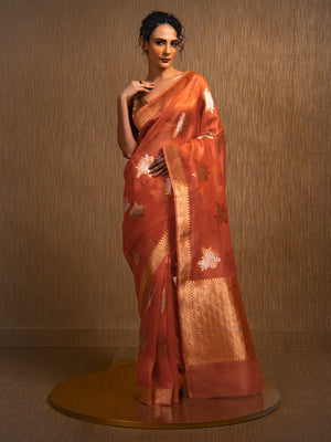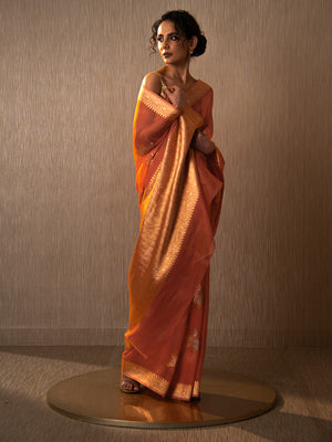 Pure organza sarees by sacred weaves in orange. It has a beautiful gold zari border. Saree has a silver-gold zari boota all over. This charming handwoven organza saree in the daintiest of hues and beguiling zari work is apt for all celebrations. The Saree looks stunning and captivating on the drape.