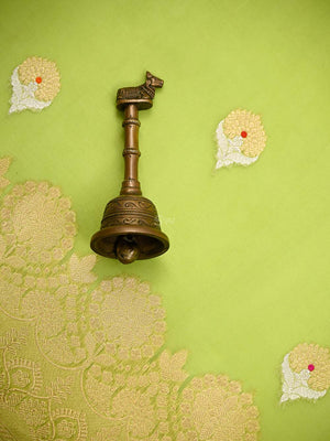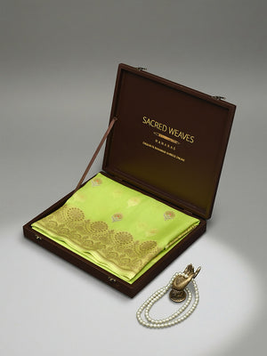 Pure organza sarees by sacred weaves in parrot green. It has a beautiful gold zari border. Saree has a meenakari silver-gold zari boota all over. This charming handwoven organza saree in the daintiest of hues and beguiling zari work is apt for all celebrations. The Saree looks stunning and captivating on the drape.