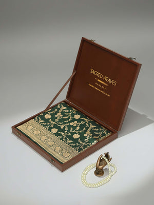 Authentic bottle green uppada silk Banarasi saree featuring gold zari jaal work. This handloom masterpiece offers luxurious texture and traditional craftsmanship, making it ideal for weddings and special celebrations.