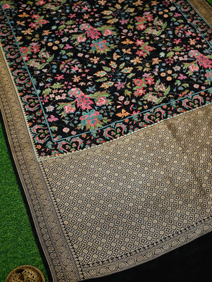 Experience the perfect blend of tradition and modern elegance with our Banarasi saree. Crafted from luxurious satin silk, it features vibrant digital floral designs and a golden sparrow border. Elevate your style and comfort at weddings with this timeless and beautiful saree.