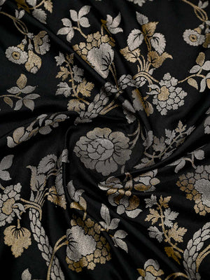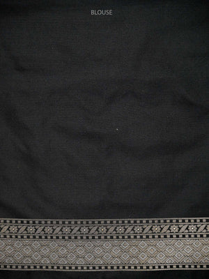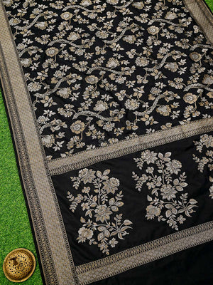 This black Katan silk Banarasi saree features exquisite Sona Roopa zari work and a matching border. The soft fabric drapes effortlessly for all-day comfort. A true handloom masterpiece combining traditional craftsmanship with practical elegance, perfect for festivals and celebrations.