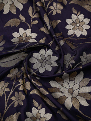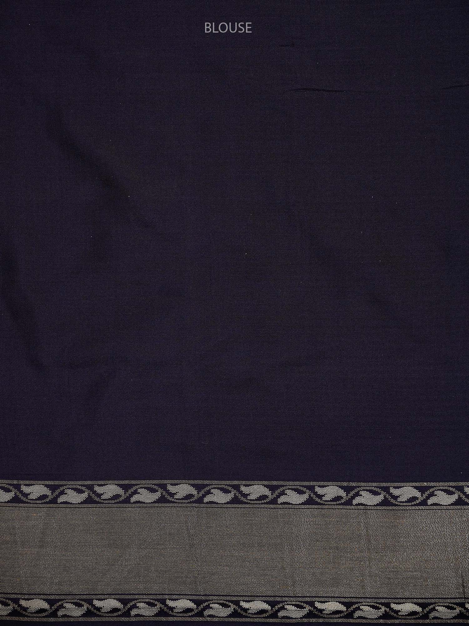 This navy blue Katan silk Banarasi saree features exquisite Sona Roopa zari work and a matching border. The soft fabric drapes effortlessly for all-day comfort. A true handloom masterpiece combining traditional craftsmanship with practical elegance, perfect for festivals and celebrations.