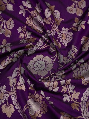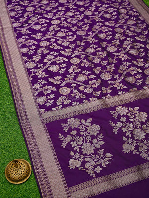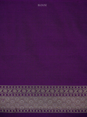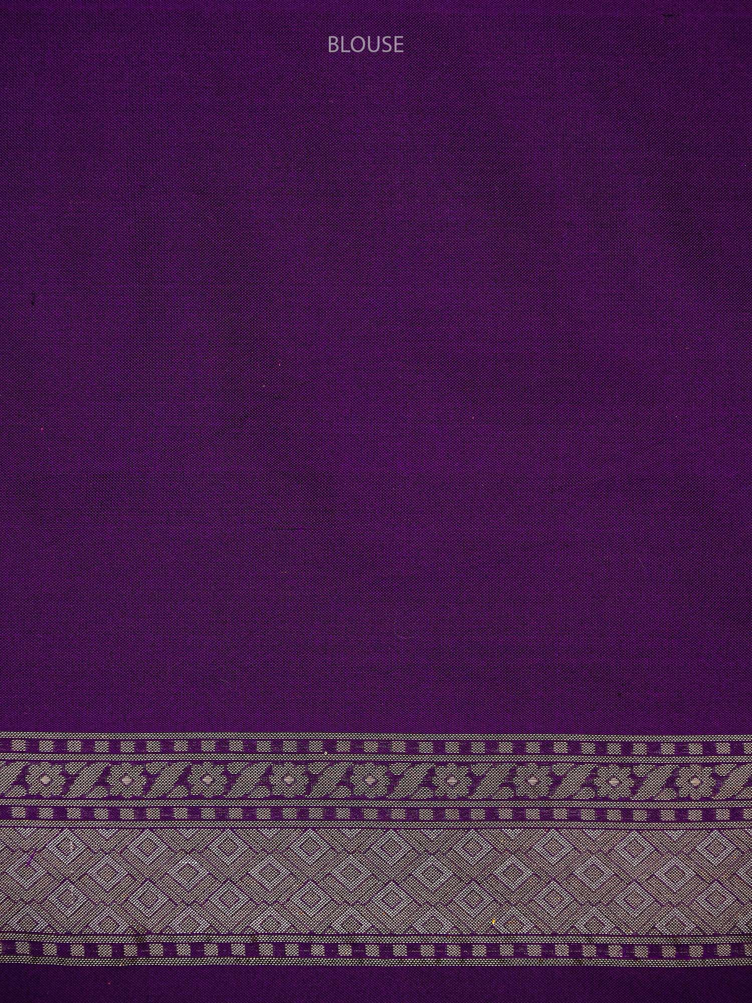 This purple Katan silk Banarasi saree features exquisite Sona Roopa zari work and a matching border. The soft fabric drapes effortlessly for all-day comfort. A true handloom masterpiece combining traditional craftsmanship with practical elegance, perfect for festivals and celebrations.