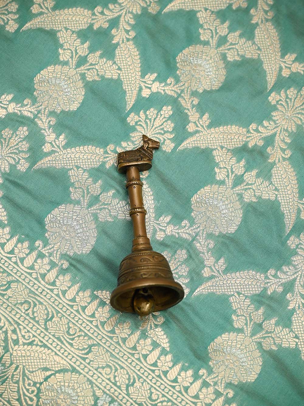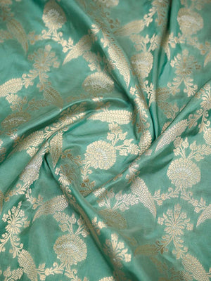 Authentic aqua green uppada silk Banarasi saree featuring silver gold zari jaal work. This handloom masterpiece offers luxurious texture and traditional craftsmanship, making it ideal for weddings and special celebrations.