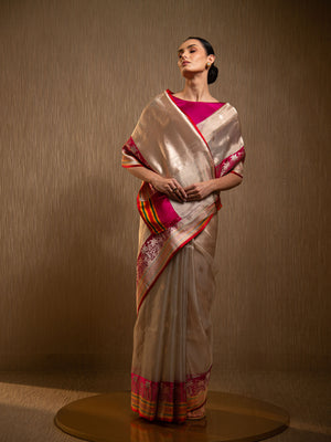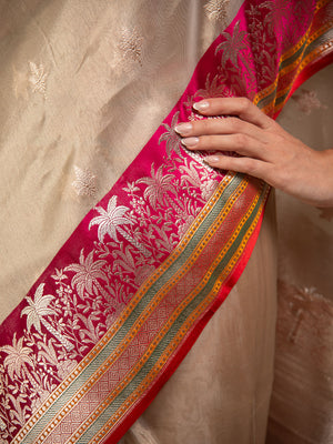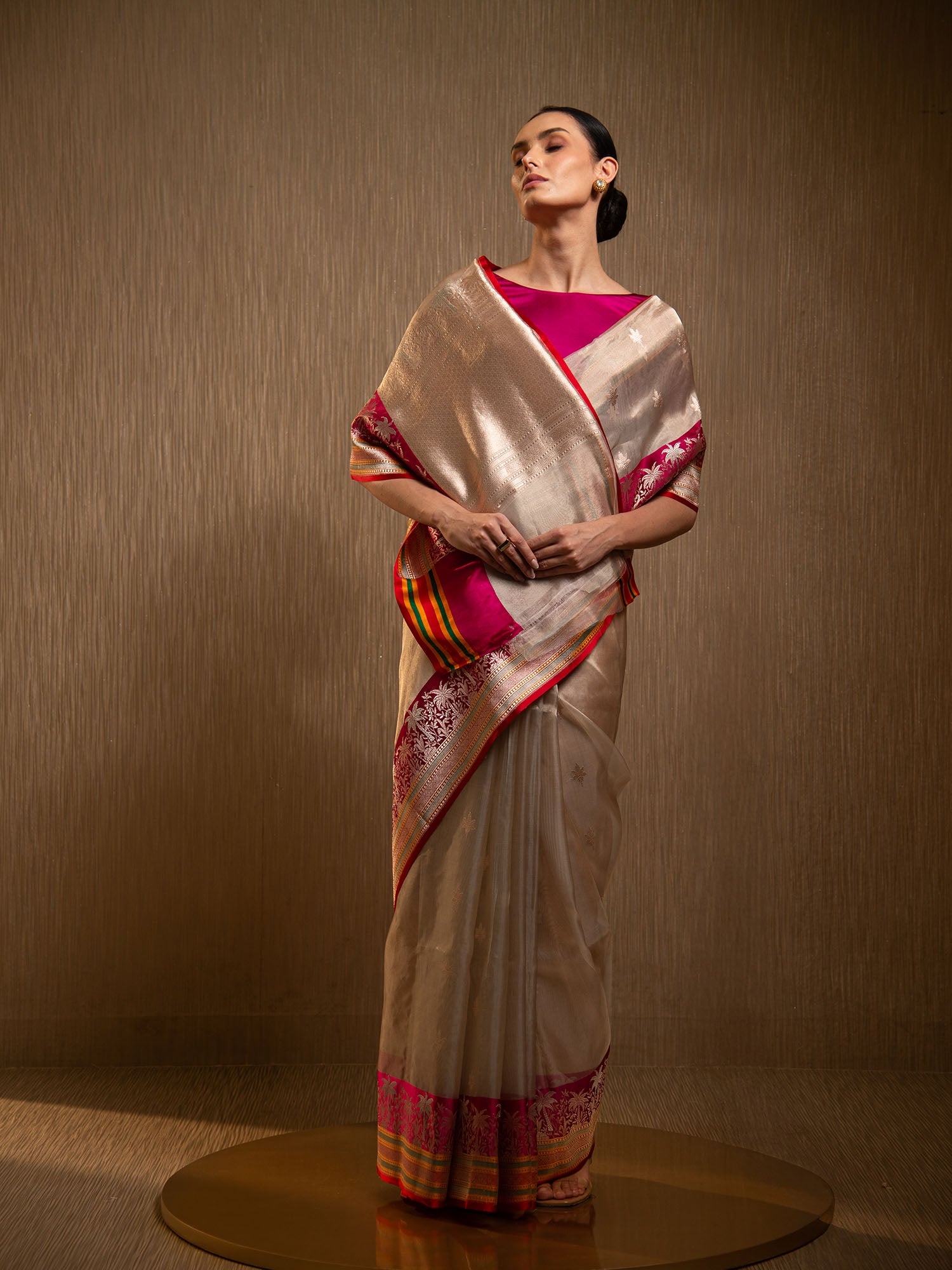 One of our stunning saree in gorgeous beige color this season. It's a luxury to be passed on to generations. Beautiful gold zari booti all over with intricate detailing adds glamour to the saree. Contrast gold zari border and breathtaking pallu bring the best of Indian weaving heritage. It's an elegant classic handwoven luxury.
