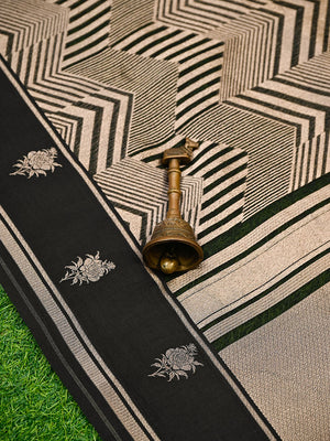 Directly crafted from the heart of Banaras, this Black Silk Brocade Handloom Banarasi Saree combines traditional artistry with modern elegance. Its soft brocade fabric offers effortless draping and lightweight comfort, making it an ideal choice for young women who appreciate timeless style with a contemporary touch. This saree’s rich texture and classic appeal make it perfect for both formal occasions and festive celebrations.