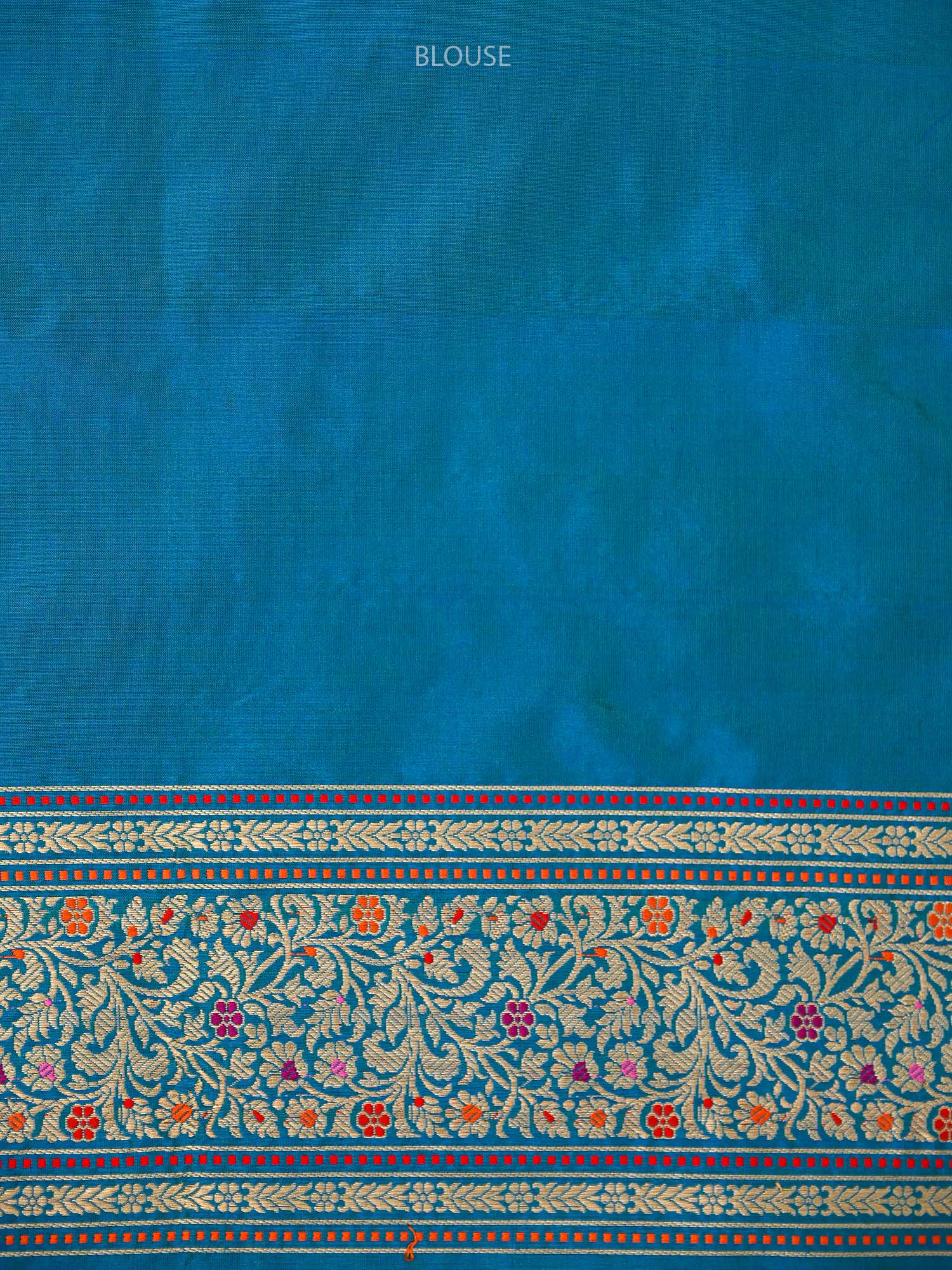 Embrace timeless beauty with this blue green Katan Silk Handloom Banarasi Saree, showcasing authentic artisanal excellence. Delicate, scattered motifs adorn the fabric. Its border features vibrant multi-coloured tulip designs and intricate gold meenakari work, framed by bold red piping. The pallu displays refined meenakari embellishments and textured stripes. Handwoven with meticulous attention, this saree is ideal for weddings and special celebrations.