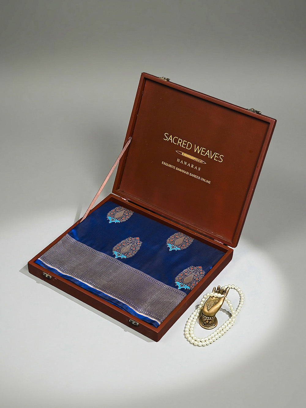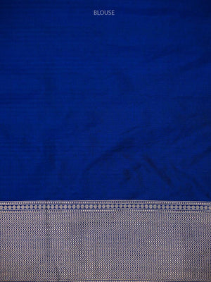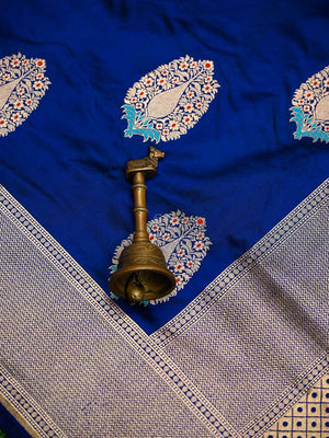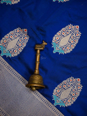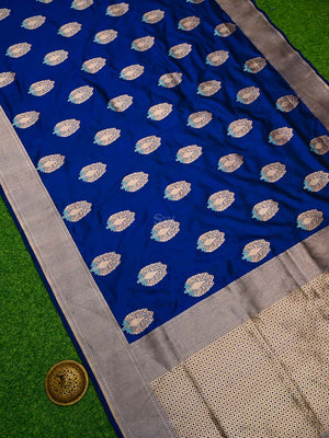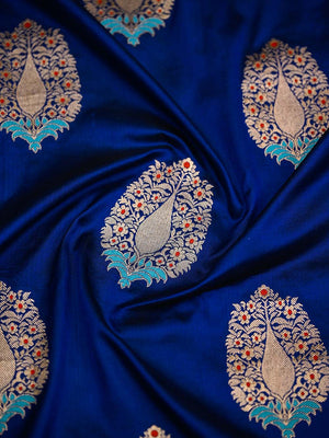 It's a heavy saree in gorgeous blue with gold zari and meenakari floral boota on the entire body. Meenakari is a melange of resham and zari during the weaving process. It's an artistic tradition and a classic masterpiece. The saree has a gorgeous border and heavy zari Pallu. This marvelous piece must for your trousseau collection.