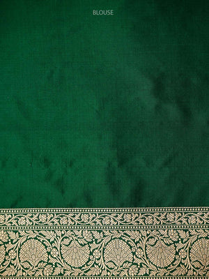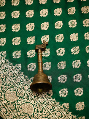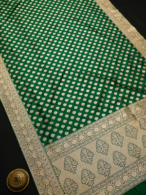Authentic bottle green uppada silk Banarasi saree featuring gold zari booti work. This handloom masterpiece offers luxurious texture and traditional craftsmanship, making it ideal for weddings and special celebrations.