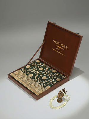 Authentic bottle green uppada silk Banarasi saree featuring gold zari jaal work. This handloom masterpiece offers luxurious texture and traditional craftsmanship, making it ideal for weddings and special celebrations.