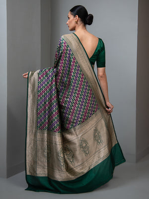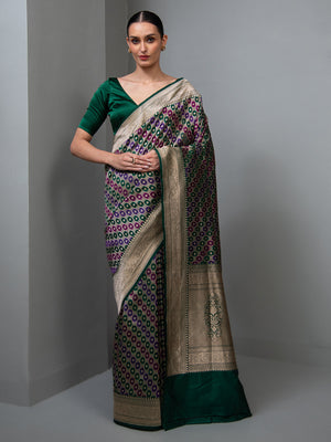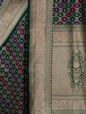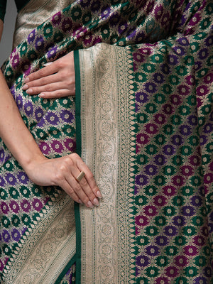 This elegant Rangkat saree in a vibrant bottle green shade is adorned with intricate gold zari floral jaal, enhancing its timeless beauty. Featuring a delicate floral gold zari border and a captivating pallu, it reflects the finest traditions of Indian weaving heritage. Handwoven with exceptional skill, this luxurious classic promises to be a treasured heirloom for generations to come.