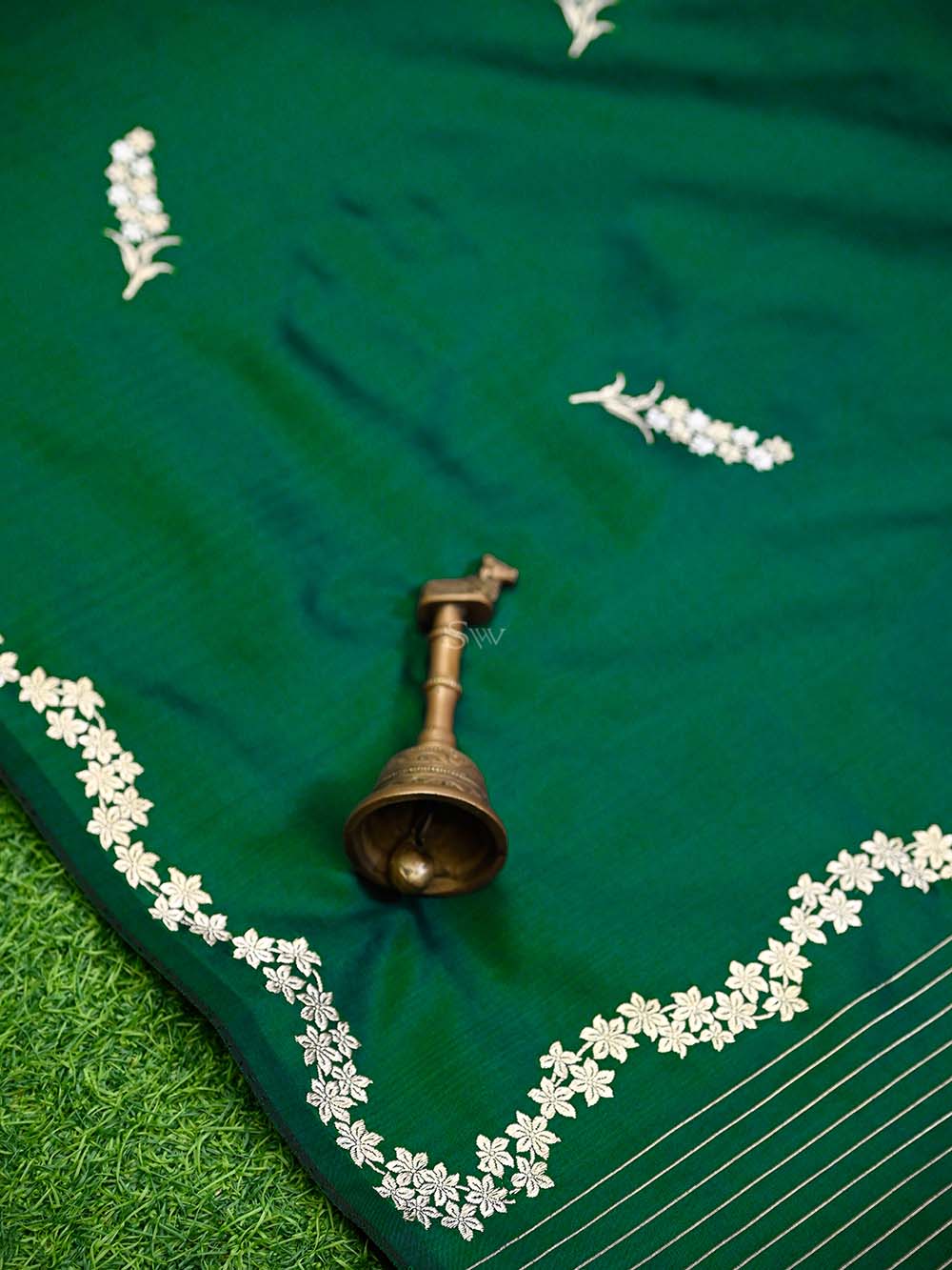 This bottle green katan silk saree showcases exquisite sona roopa booti florals with a radiant gold zari border. Handwoven with precision, it combines timeless elegance and heritage craftsmanship, making it perfect for weddings, festivals, and special occasions.