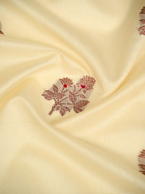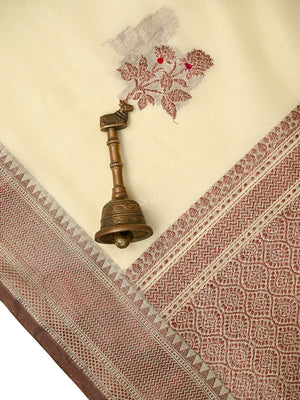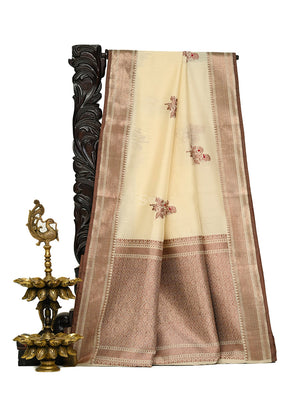 Chanderi Silk, Evergreen & Timeless Sarees that evoke festivity & Joy. Classic motifs featured on silk makes it a splendid drape. Bringing your finest weaves from Banaras in Cream color. The Saree looks stunning and captivating on drape. It's a classic traditional saree apt for all celebrations.