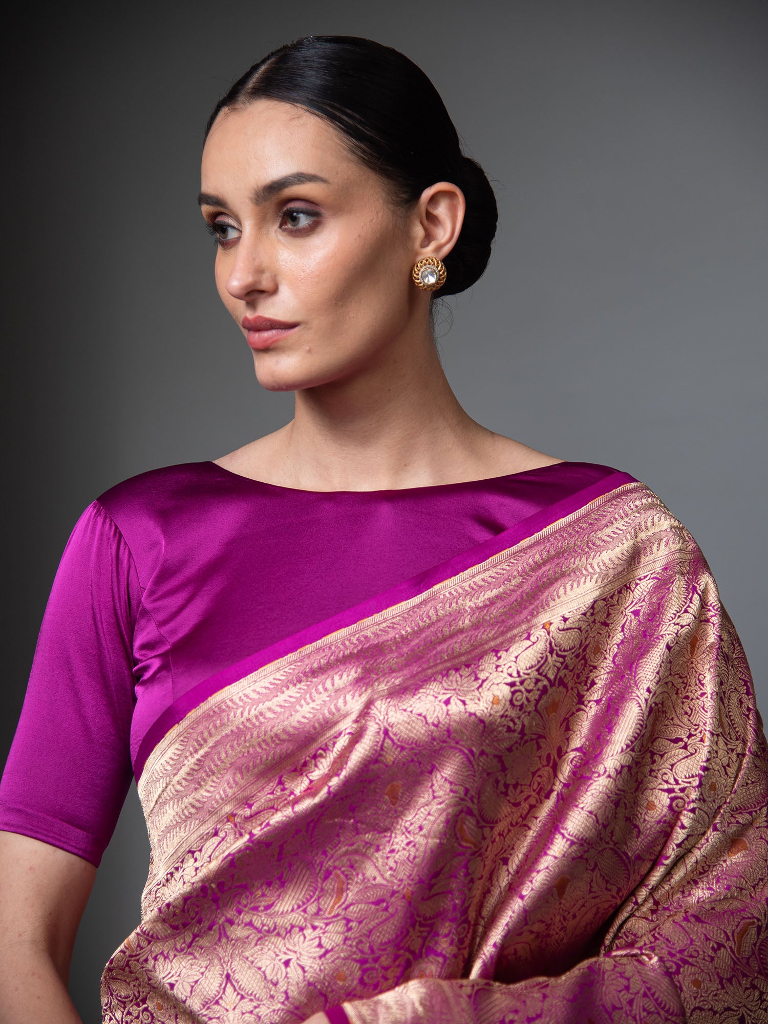 Directly crafted from the heart of Banaras, this Dark Magenta Silk Brocade Handloom Banarasi Saree combines traditional artistry with modern elegance. Its soft brocade fabric offers effortless draping and lightweight comfort, making it an ideal choice for young women who appreciate timeless style with a contemporary touch. This saree’s rich texture and classic appeal make it perfect for both formal occasions and festive celebrations.
