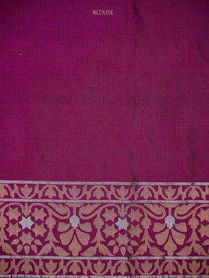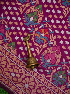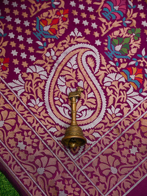 This dark magenta Katan silk Banarasi saree features exquisite meenakari Sona Roopa zari work and a matching border. The soft fabric drapes effortlessly for all-day comfort. A true handloom masterpiece combining traditional craftsmanship with practical elegance, perfect for festivals and celebrations.