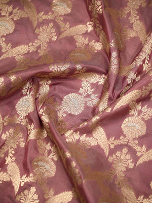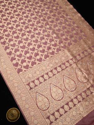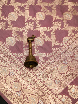 Authentic dusty pink uppada silk Banarasi saree featuring silver gold zari jaal work. This handloom masterpiece offers luxurious texture and traditional craftsmanship, making it ideal for weddings and special celebrations.