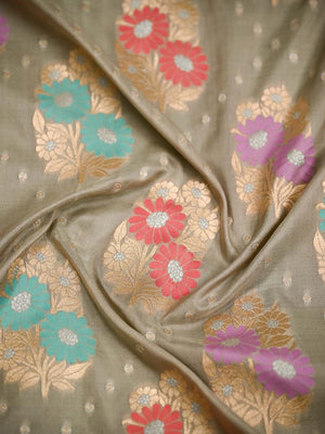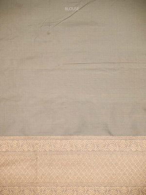 It's a heavy saree in gorgeous grey with gold zari and meenakari floral jaal on the entire body. Meenakari is a melange of resham and zari during the weaving process. It's an artistic tradition and a classic masterpiece. The saree has a gorgeous border and heavy zari Pallu. This marvelous piece must for your trousseau collection.