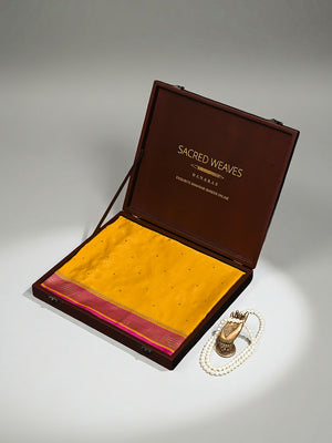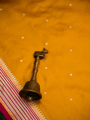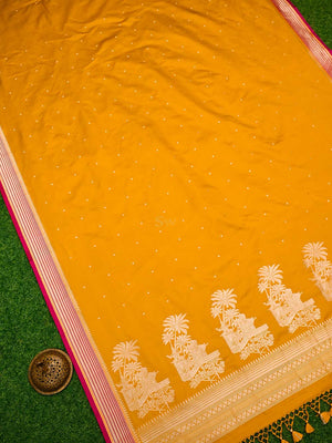 One of our stunning saree in gorgeous mustard color this season. It's a luxury to be passed on to generations. Beautiful gold zari floral booti all over with intricate detailing adds glamour to the saree. Gold zari border and breathtaking pallu bring the best of Indian weaving heritage. It's an elegant classic handwoven luxury.
