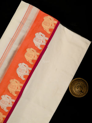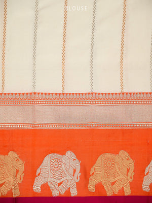 Celebrate in style with this off white handloom Banarasi saree in pure silk. Its lightweight fabric drapes beautifully while showcasing intricate animal motifs on the contrasting border and a magnificent Sona-roopa Pallu. Ideal for weddings and festivals, this saree combines traditional artistry with understated elegance for memorable occasions.