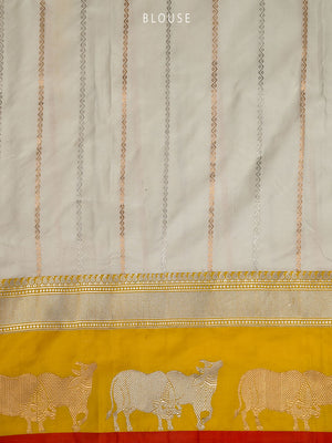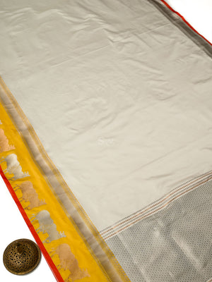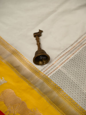 Celebrate in style with this off white handloom Banarasi saree in pure silk. Its lightweight fabric drapes beautifully while showcasing intricate animal motifs on the contrasting border and a magnificent Sona-roopa Pallu. Ideal for weddings and festivals, this saree combines traditional artistry with understated elegance for memorable occasions.