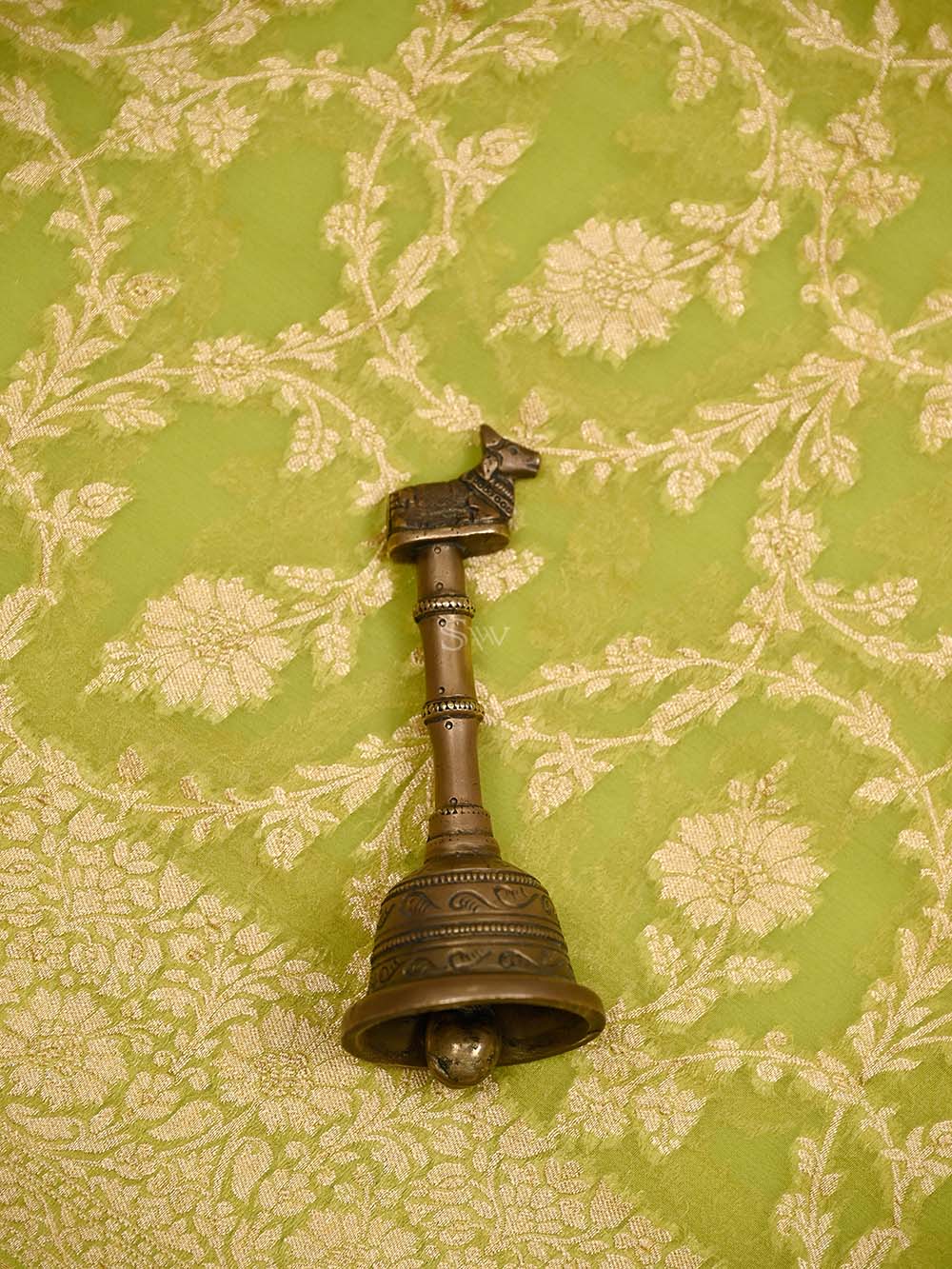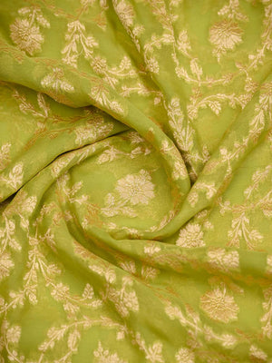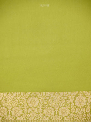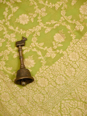 Pure khaddi georgette saree in pastel lime green color. The saree has jaal across the body with a gold zari border. It's an elegant classic handwoven Banarasi masterpiece. This free-flowing georgette saree gives a charming and alluring look on drape.