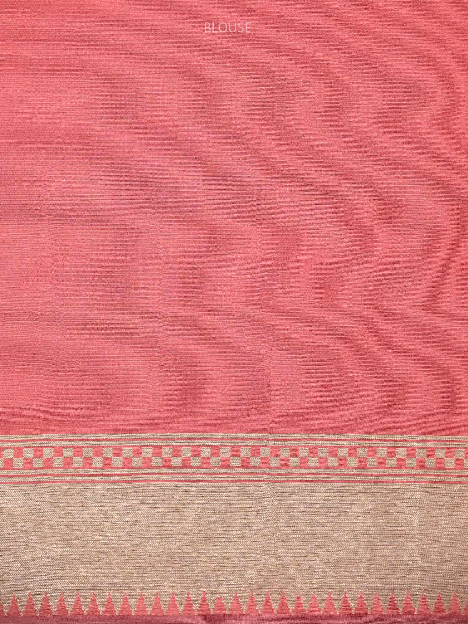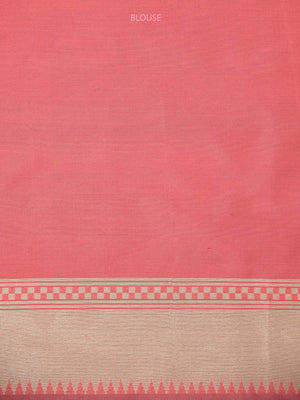 This pastel pink Katan silk saree blends tradition with modern design through contemporary stripes and geometric squares in Gold Zari. The luxurious pure silk drapes beautifully, perfect for weddings and celebrations.