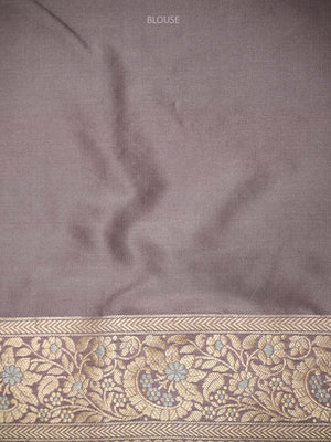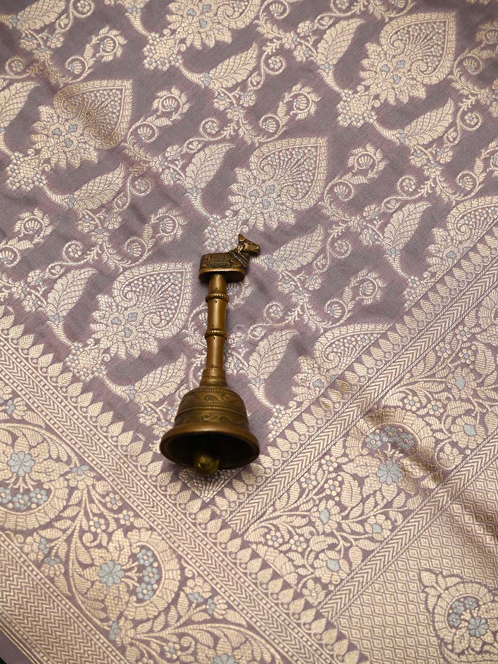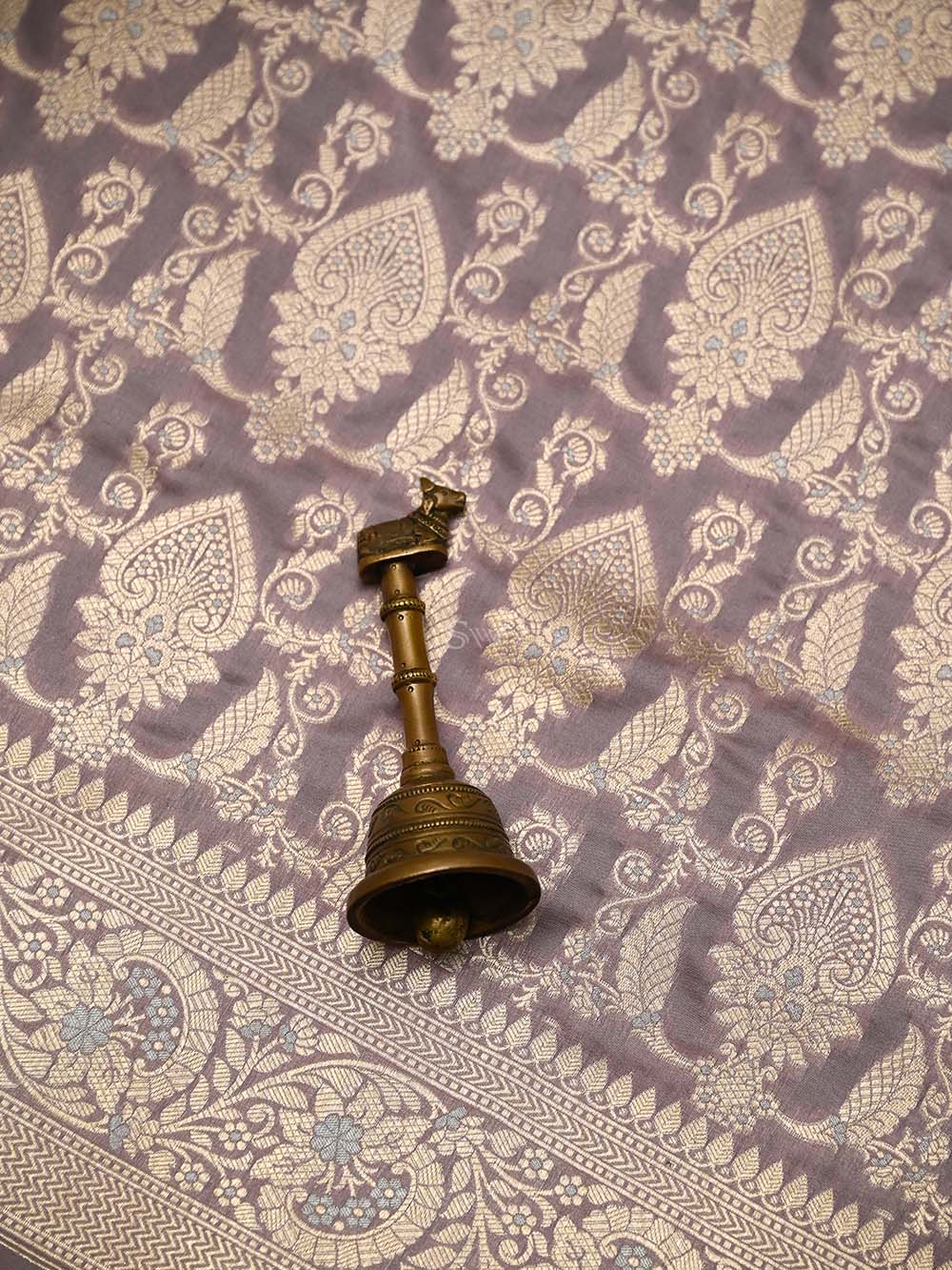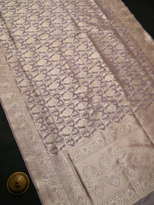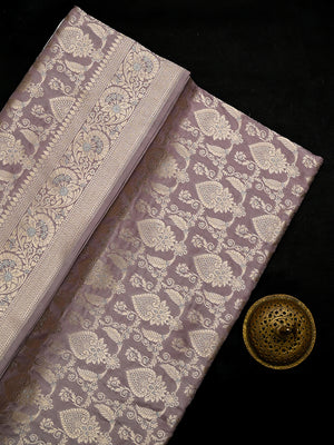 Authentic pastel purple uppada silk Banarasi saree featuring silver gold zari jaal work. This handloom masterpiece offers luxurious texture and traditional craftsmanship, making it ideal for weddings and special celebrations.