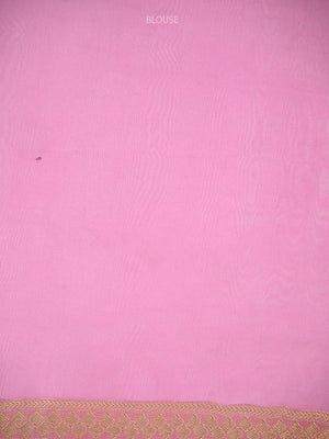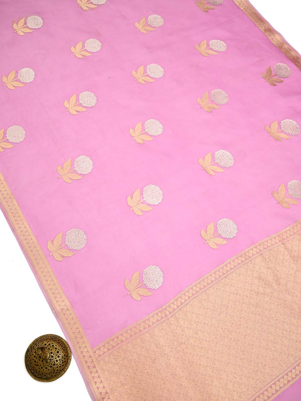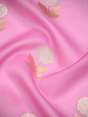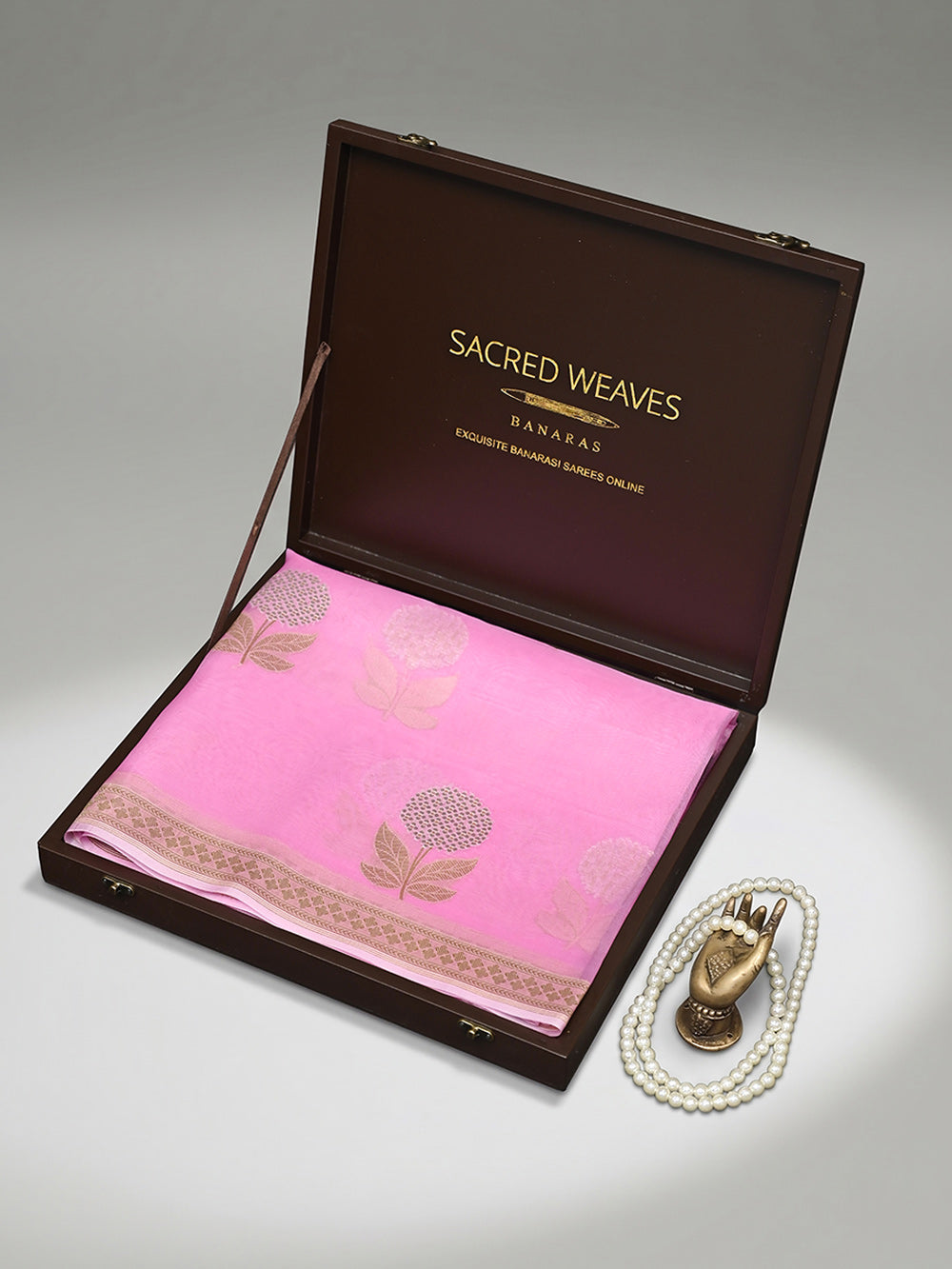 Pure organza sarees by sacred weaves in pink. It has a beautiful gold zari border. Saree has a silver-gold zari boota all over. This charming handwoven organza saree in the daintiest of hues and beguiling zari work is apt for all celebrations. The Saree looks stunning and captivating on the drape.
