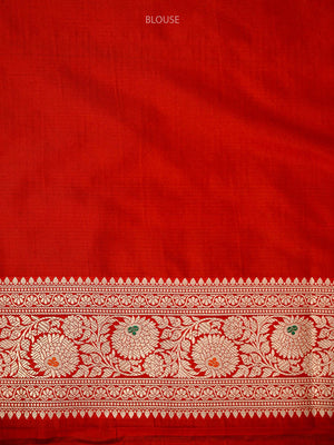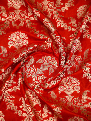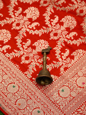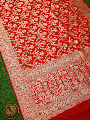 Authentic red uppada silk Banarasi saree featuring gold zari meenakari jaal work. This handloom masterpiece offers luxurious texture and traditional craftsmanship, making it ideal for weddings and special celebrations.