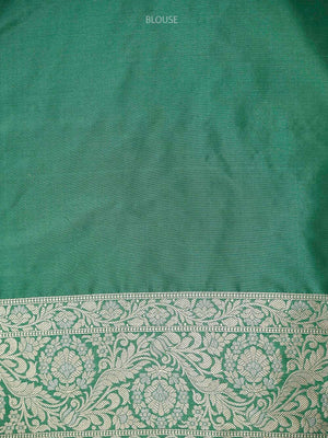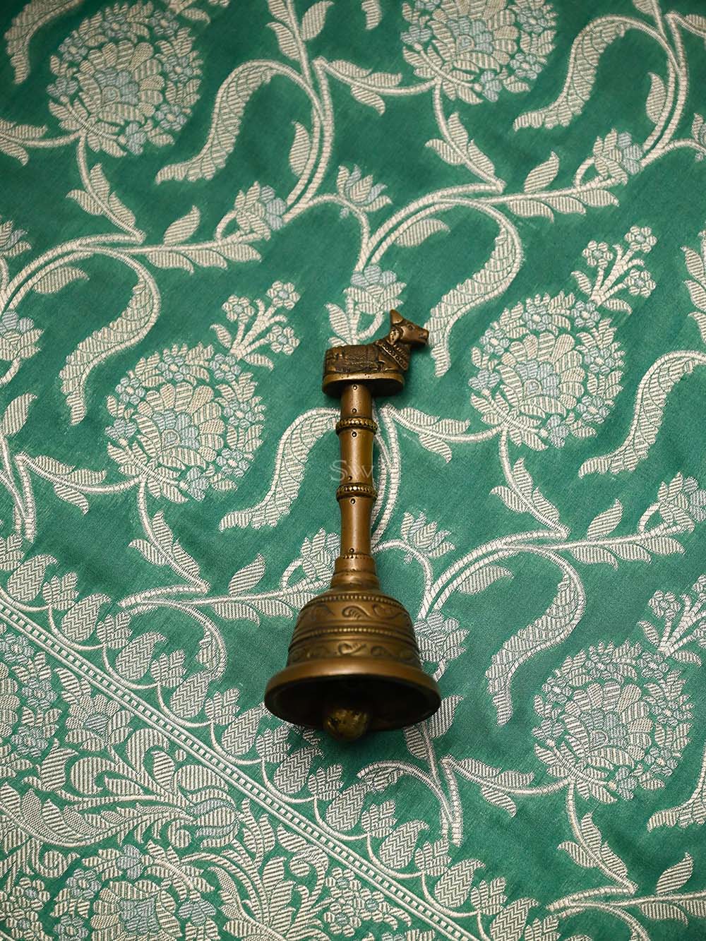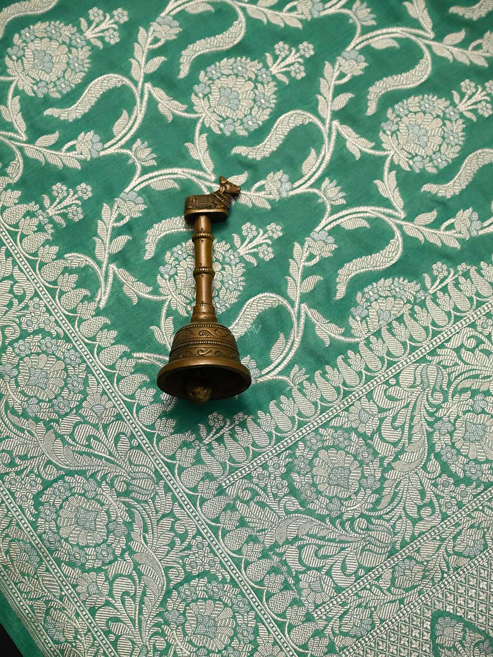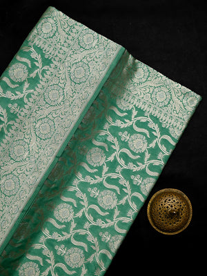 Authentic sea green uppada silk Banarasi saree featuring silver gold zari jaal work. This handloom masterpiece offers luxurious texture and traditional craftsmanship, making it ideal for weddings and special celebrations.