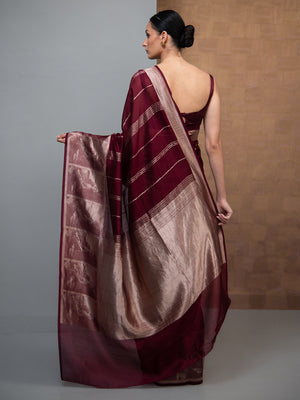 Directly crafted from the heart of Banaras, this Wine Silk Banarasi Saree combines traditional artistry with modern elegance. Its soft fabric offers effortless draping and lightweight comfort, making it an ideal choice for young women who appreciate timeless style with a contemporary touch.