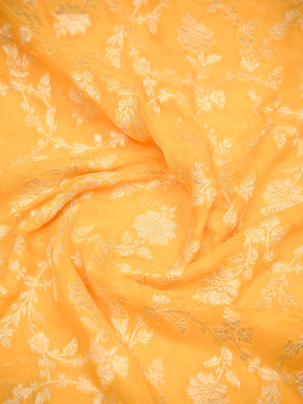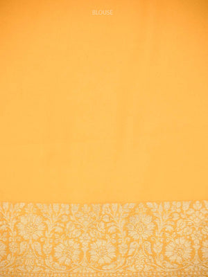 Pure khaddi georgette saree in Yellow color. The saree has jaal across the body with a gold zari border. It's an elegant classic handwoven Banarasi masterpiece. This free-flowing georgette saree gives a charming and alluring look on drape.