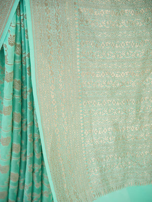 Pure khaddi georgette saree in aqua green color. The saree has jaal across the body with a gold zari border. It's an elegant classic handwoven Banarasi masterpiece. This free-flowing georgette saree gives a charming and alluring look on drape.