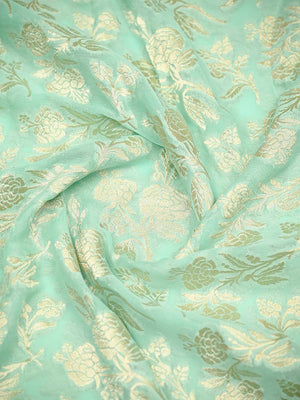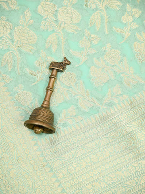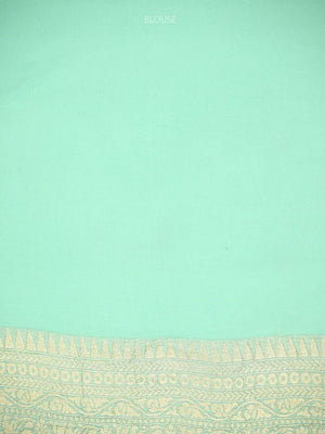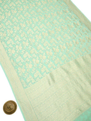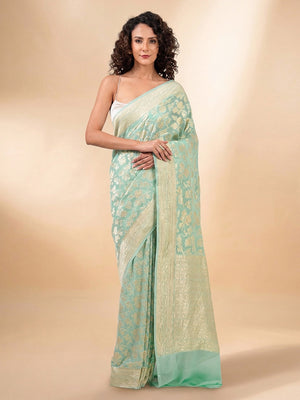 Pure Khaddi Georgette Banarasi Saree in Aqua Green color. The saree has jaal across the body with a gold zari border. It's an elegant classic handwoven Banarasi masterpiece. This free-flowing georgette saree gives a charming and alluring look on drape.